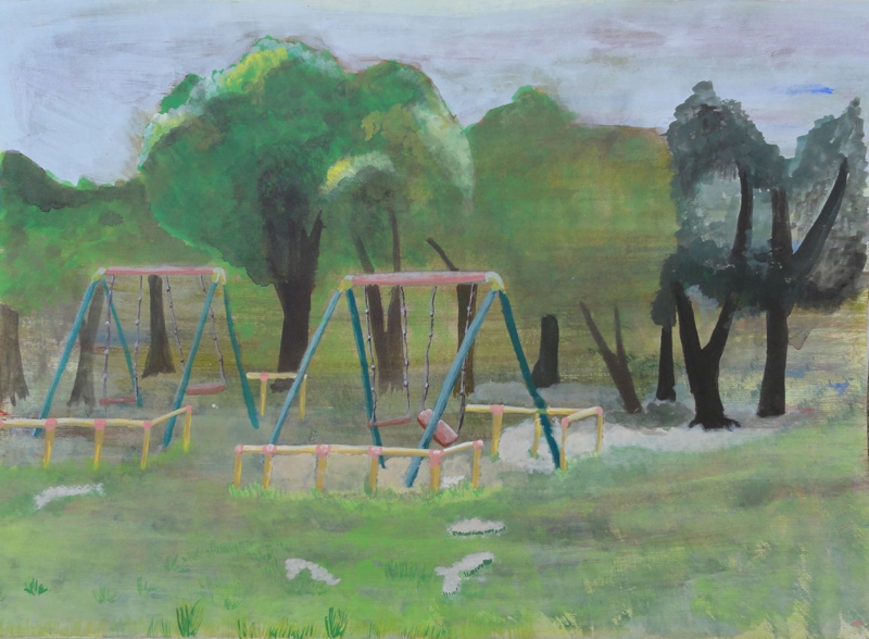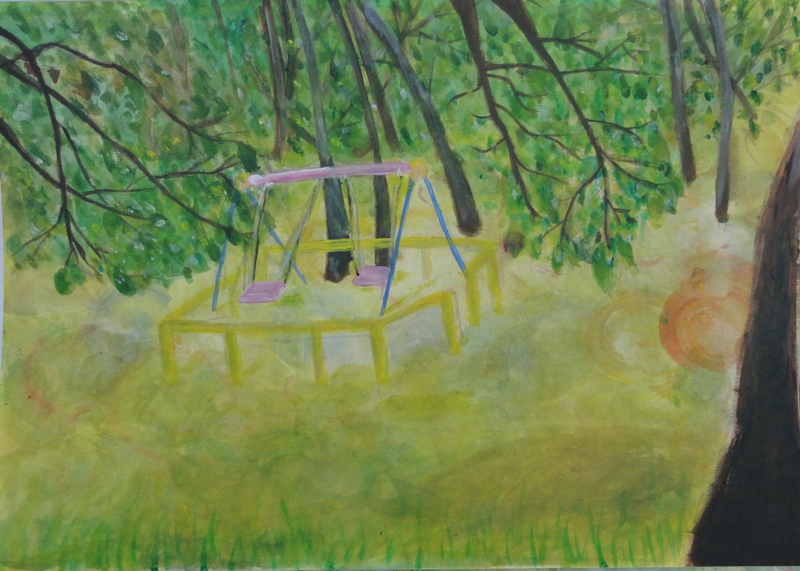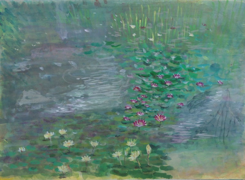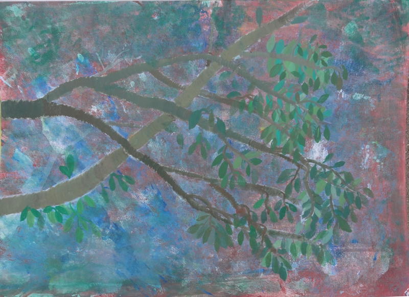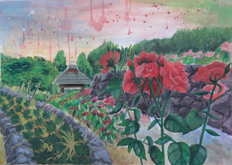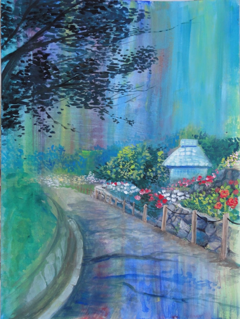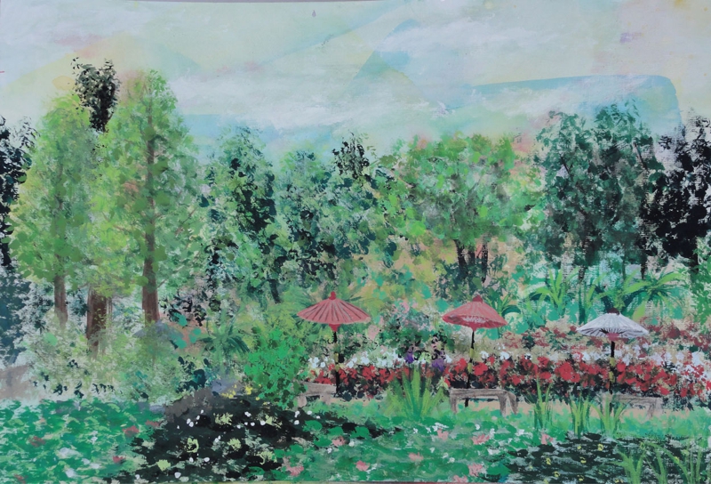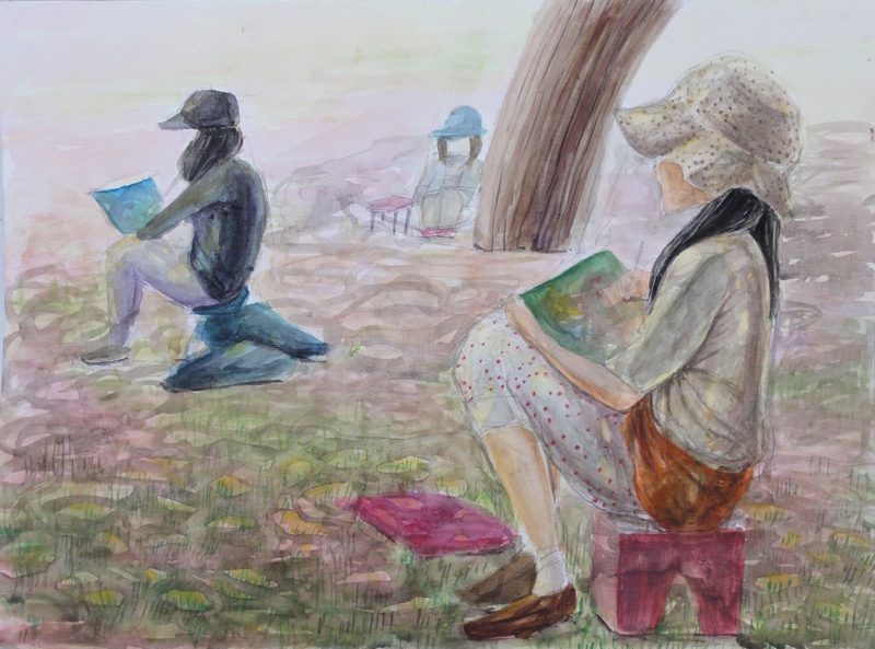 午前中は日陰だったところが午後は日向になり、パレットの絵の具の乾きに焦りながら描いていた姿もありました。